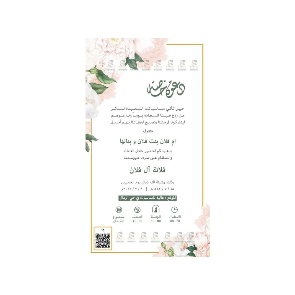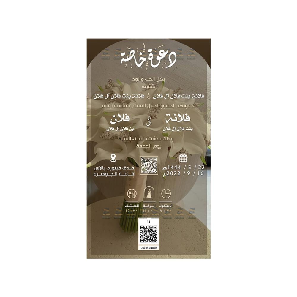 إذا كنت تبحث عن تصميم لبطاقات دعوات زفاف مع خاصية باركود الدخول QR لكل شخص فأنت بالمتجر المناسب، فإن ساز شوب هو الوجهة الأمثل لك. نحن نقدم لكم تجربة رائعة ومخصصة لإنشاء تصميم بطاقات دعوات مع إمكانية إضافة لكل بطاقة دعوة باركود الدخول QR تُلهم ضيوفكم وتُضفي لمسة من الأناقة والتميز على حفل زفافكم.