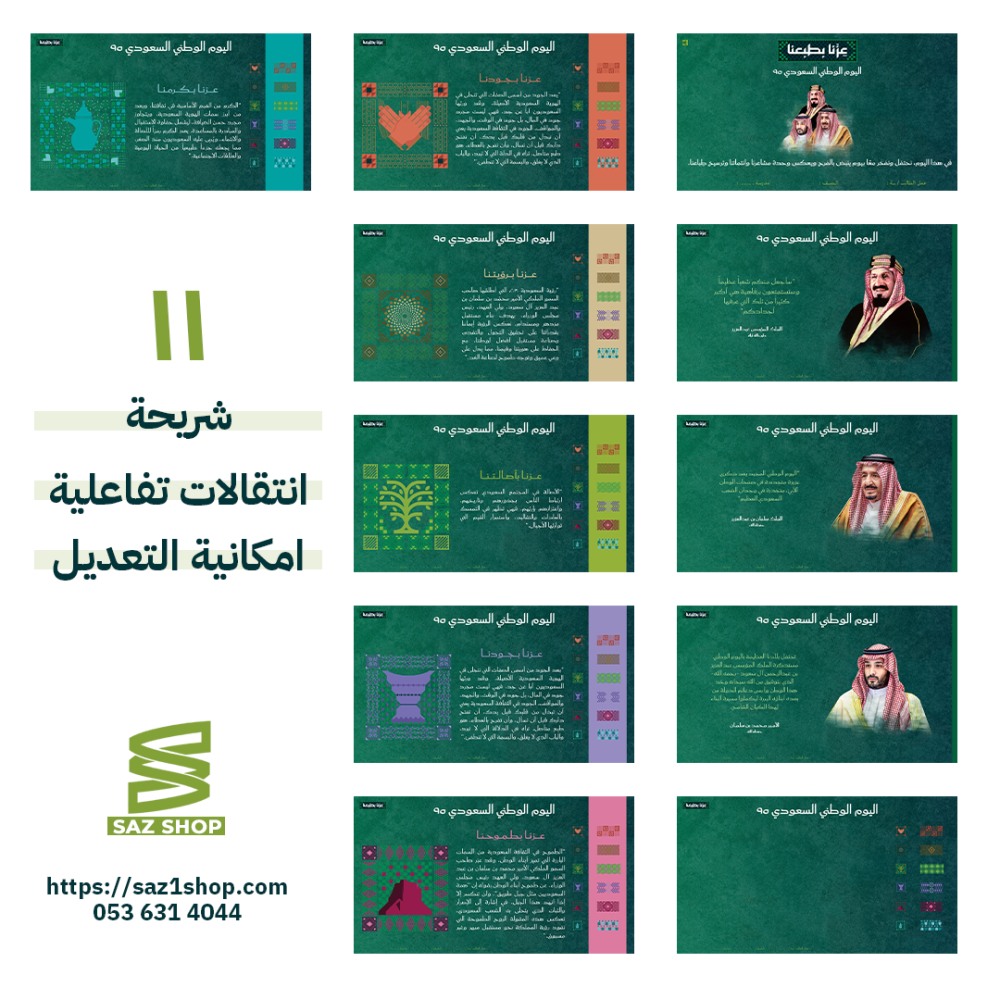 عرض تقديمي احترافي اليوم الوطني السعودي 95 قابل للتعديل والتخصيص إمكانية العرض في الجهات الحكومية والخاصة والإدارات التعليمية والمدارس كما يتوفر نسخة خاصة بالطلاب